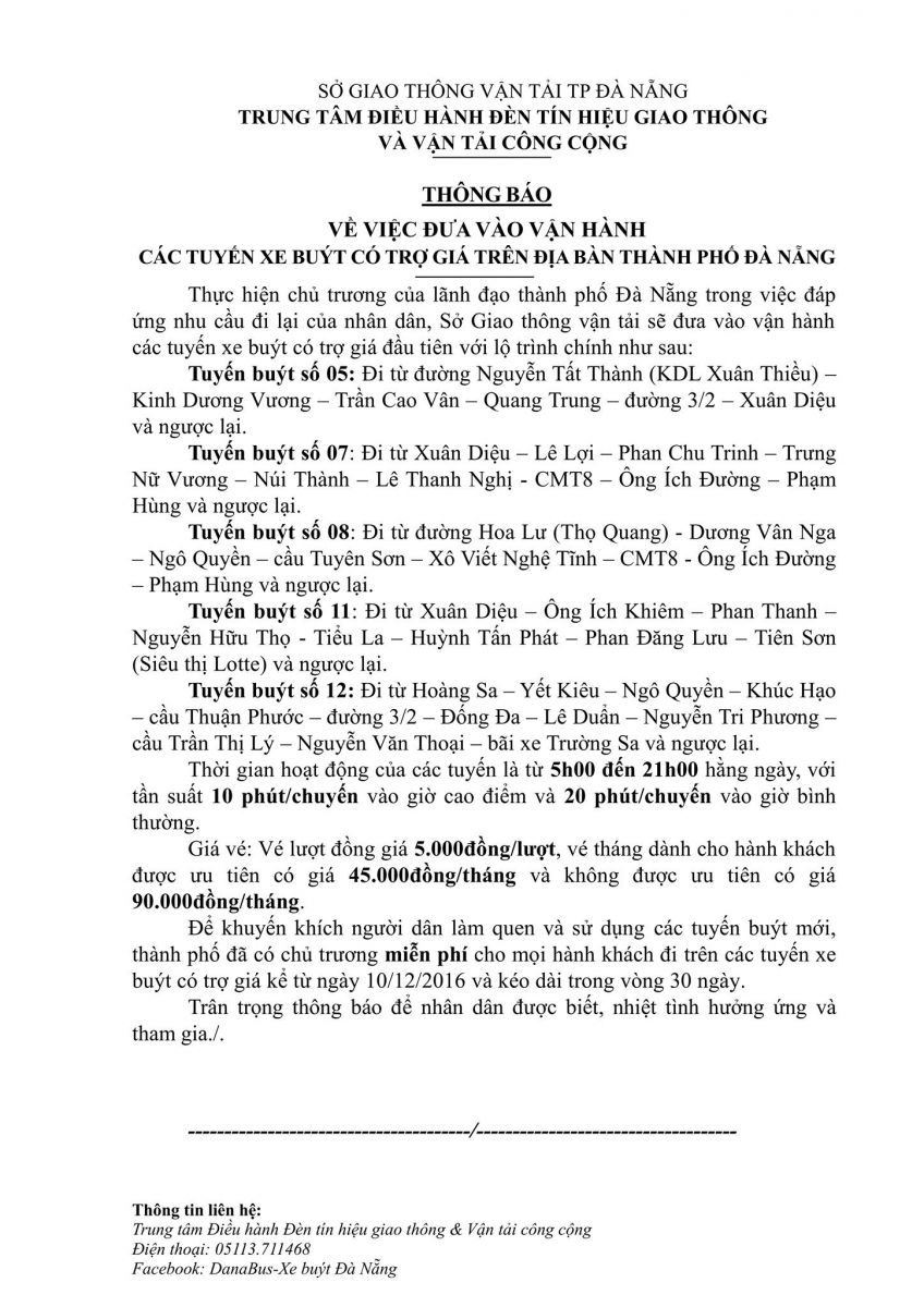Kể từ ngày 10/12/2016, Thành Phố Đà Nẵng đưa vào hoạt động 3 tuyến xe bus mới (còn gọi là bus trợ giá) của Xe Quảng An 1, gồm: Tuyến số 5, tuyến số 7 và tuyến số 11. Hai tuyến còn lại gồm: Tuyến số 8 và tuyến số 12 bắt đầu hoạt động kể từ ngày 01/01/2017. Để dễ dàng làm quen và trải nghiệm với dịch vụ mới, TP Đà Nẵng quyết định sẽ cho các tuyến bus này chạy hoàn toàn miễn phí trong vòng 30 ngày để phục vụ người dân và du khách.